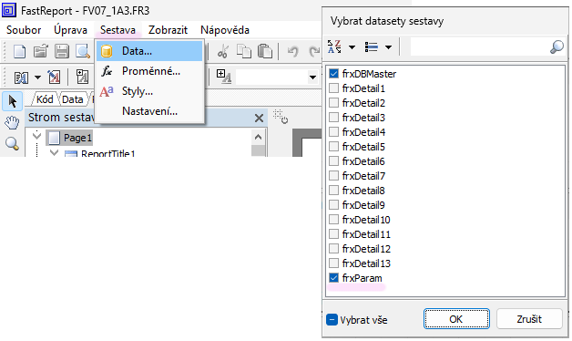 • V okně Vybrat dataset sestavy zaklikněte frxParam (pozor, je až na konci seznamu patnácti datasetů).