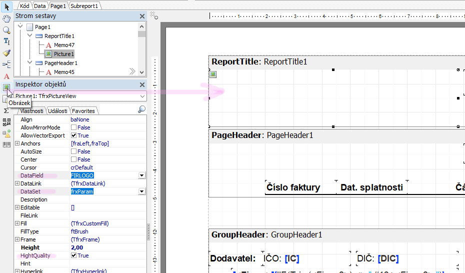 • V Inspektoru objektů - na záložce Vlastnosti přiřaďte frxParam k vlastnosti DataSet a obdobně přiraďte FIRLOGO k vlastnosti DataField.