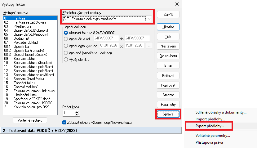 Ve okně Výstupy vyberte požadovanou předlohu, klikněte na tlačítko Správa a zvolte Export předlohy...